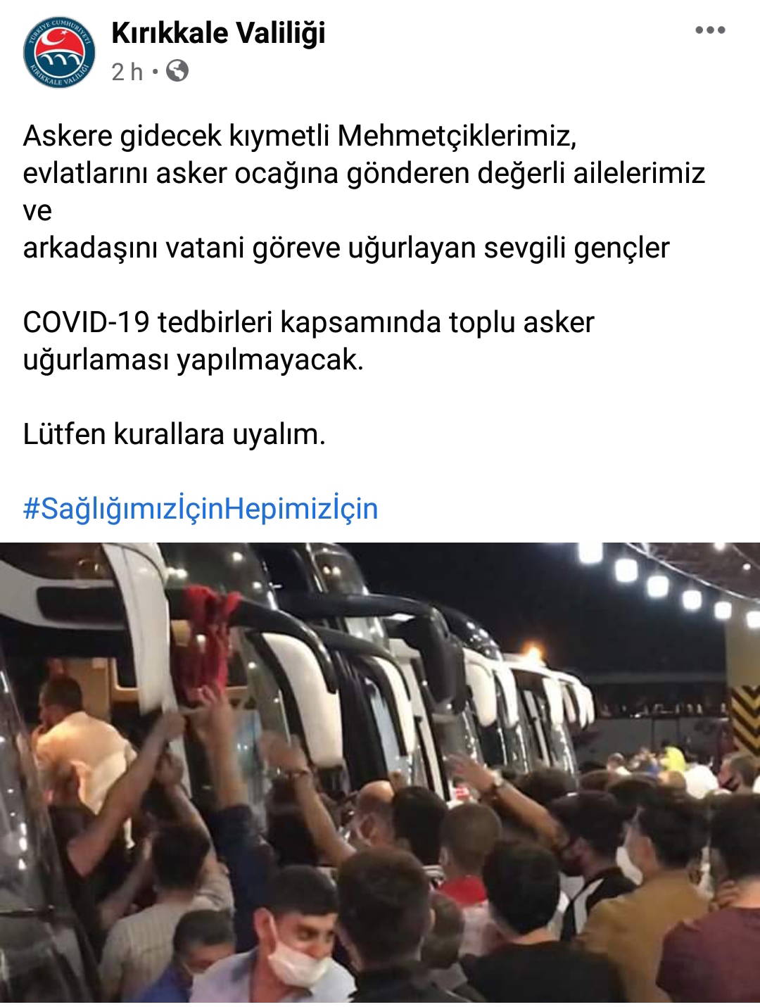 Kırıkkale Valiliği'nin Twitter hesabından yapılan açıklamada, "Askere gidecek kıymetli Mehmetçiklerimiz, evlatlarını asker ocağına gönderen değerli ailelerimiz ve arkadaşını vatani göreve uğurlayan sevgili gençler, COVİD-19 tedbirleri kapsamında toplu asker uğurlaması yapılmayacak. Lütfen kurallara uyalım" denildi.