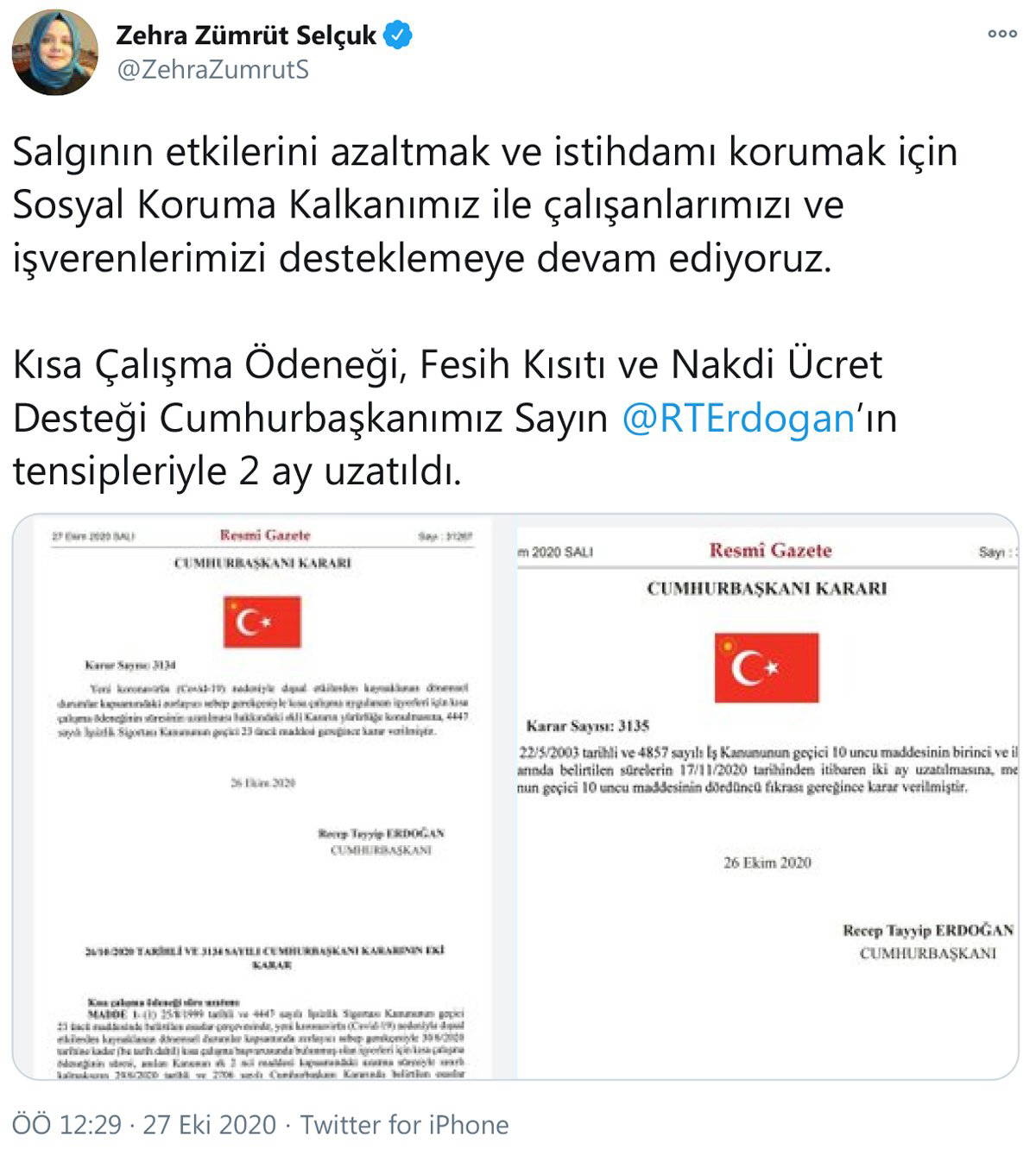 Aile, Çalışma ve Sosyal Hizmetler Bakanı Zehra Zümrüt Selçuk, ''“Salgının etkilerini azaltmak ve istihdamı korumak için Sosyal Koruma Kalkanımız ile çalışanlarımızı ve işverenlerimizi desteklemeye devam ediyoruz. Kısa Çalışma Ödeneği, Fesih Kısıtı ve Nakdi Ücret Desteği Cumhurbaşkanımız Sayın Recep Tayyip Erdoğan’ın tensipleriyle 2 ay uzatıldı” ifadelerini kullandı.