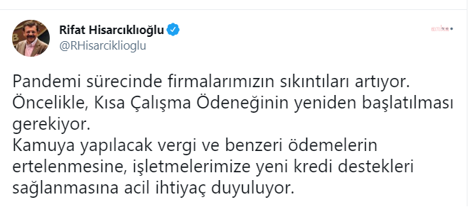 Çalışanların ve işverenlerin yoğun taleplerine rağmen bitirilen uygulamanın geri döndürülmesi için TOBB Başkanı Rifat Hisarcıklıoğlu, sosyal medya (twitter) hesabından yaptığı açıklamada, “Pandemi sürecinde firmalarımızın sıkıntıları artıyor. Öncelikle, kısa çalışma ödeneğinin yeniden başlatılması gerekiyor. Kamuya yapılacak vergi ve benzeri ödemelerin ertelenmesine, işletmelerimize yeni kredi destekleri sağlanmasına acil ihtiyaç duyuluyor” ifadelerini kullandı.