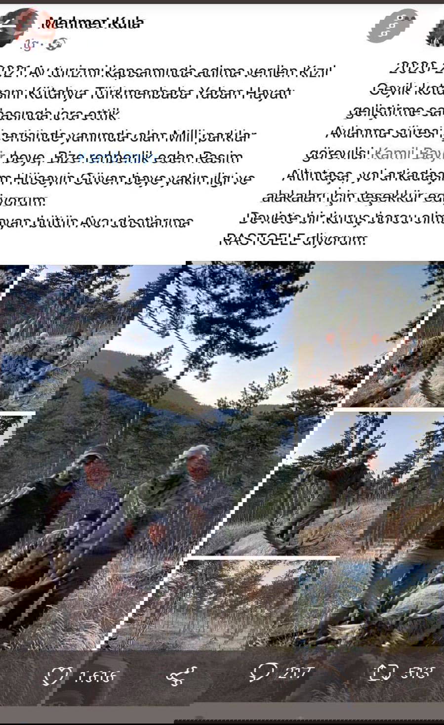 Tarım ve Orman Bakanlığı, kızıl geyik acente kotalarının avlattırılmasına ilişkin 14 bin ile 30 bin lirasında bedellerle "ihale" açtı. Bu ihaleye katılıp Kütahya ve Eskişehir arasındaki Türkmen Dağı eteklerindeki kızıl geyik avına çıkan Alanya'nın kapatılan Güzelbağ belde belediyesinin eski başkanı MHP'li Mehmet Kula, avladığı kızıl geyiğin fotoğrafını sosyal medyadan paylaştı. Kula fotoğrafın altına da, “2020-2021 Av turizmi kapsamında adıma verilen kızıl geyik kotasını Kütahya Türkmenbaba Yaban Hayatı geliştirme sahasında icra ettik. Avlanma süresi içerisinde yanımda olan Milli Parklar görevlisi Kamil Bayır Beye, bize rehberlik eden Rasim Altıntaş’a, yol arkadaşım Hüseyin Güven Beye yakın ilgi ve alakaları için teşekkür ediyorum. Devlete bir kuruş borcu olmayan bütün avcı dostlarıma rastgele diyorum” diye yazdı.