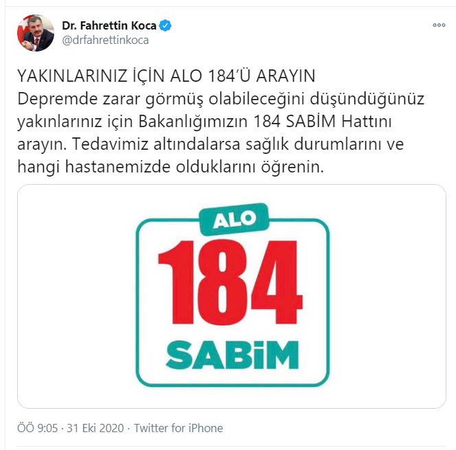 "Depremde zarar görmüş olabileceğini düşündüğünüz yakınlarınız için Bakanlığımızın 184 SABİM hattını arayın. Tedavimiz altındalarsa sağlık durumlarını ve hangi hastanemizde olduklarını öğrenin."