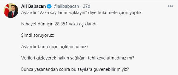 DEVA Partisi Genel Başkanı Ali Babacan, "Aylardır “Vaka sayılarını açıklayın” diye hükümete çağrı yaptık.Nihayet dün için 28.351 vaka açıklandı. Şimdi soruyoruz: Aylardır bunu niçin açıklamadınız? Verileri gizleyerek halkın sağlığını tehlikeye atmadınız mı? Bunca yaşanandan sonra bu sayılara güvenebilir miyiz" ifadelerini kullandı.