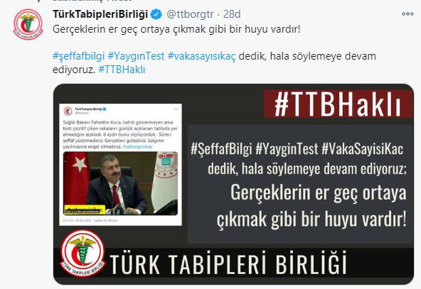 Türk Tabipleri Birliği, "Gerçeklerin er geç ortaya çıkmak gibi bir huyu vardır! #şeffafbilgi #YaygınTest #vakasayısıkaç dedik, hala söylemeye devam ediyoruz. #TTBHaklı" dedi.