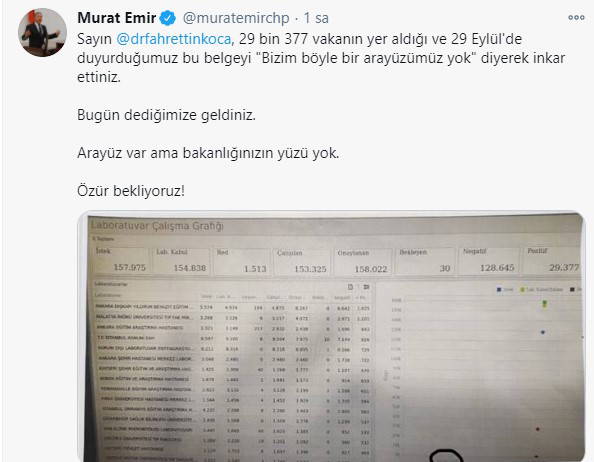 CHP Ankara Milletvekili Murat Emir, "Sayın @drfahrettinkoca, 29 bin 377 vakanın yer aldığı ve 29 Eylül'de duyurduğumuz bu belgeyi "Bizim böyle bir arayüzümüz yok" diyerek inkar ettiniz. Bugün dediğimize geldiniz. Arayüz var ama bakanlığınızın yüzü yok. Özür bekliyoruz" diyerek tepkisini dile getirdi