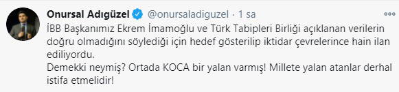 CHP Genel Başkan Yardımcısı ve İstanbul Milletvekili Onursal Adıgüzel, "İBB Başkanımız Ekrem İmamoğlu ve Türk Tabipleri Birliği açıklanan verilerin doğru olmadığını söylediği için hedef gösterilip iktidar çevrelerince hain ilan ediliyordu. Demekki neymiş? Ortada KOCA bir yalan varmış! Millete yalan atanlar derhal istifa etmelidir" diye konuştu.