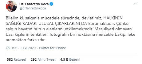 "Bilelim ki, salgınla mücadele sürecinde, devletimiz, HALKININ SAĞLIĞI KADAR, ULUSAL ÇIKARLARINI DA korumaktadır. Çünkü salgın hayatın bütün alanlarını etkilemektedir. Mesuliyeti olmayan bazı kişilerin tenkitleri, fotoğrafın bir noktasına mercekle bakıp, leke aramaktan farksızdır." diye yazdı.