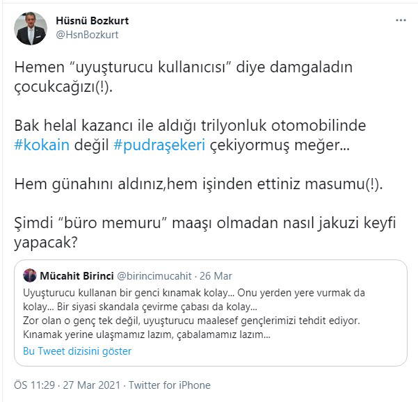 CHP'li Hüsnü Bozkurt Birinci'nin bu açıklamlarını tiye aldı. AKP'li Birinci'ye yanıt veren Bozkurt, "Hemen “uyuşturucu kullanıcısı” diye damgaladın çocukcağızı! Bak helal kazancı ile aldığı trilyonluk otomobilinde kokain değil pudra şekeri çekiyormuş meğer... Hem günahını aldınız, hem işinden ettiniz masumu! Şimdi “büro memuru” maaşı olmadan nasıl jakuzi keyfi yapacak?" dedi.