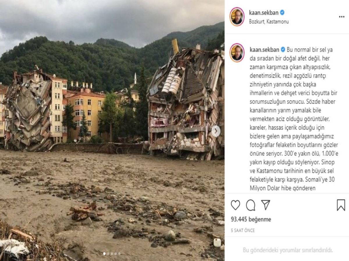 Sel felaketine tepkiler sürerken, ünlü isimler de yaşananlara karşı sessiz kalmıyor. Son olarak olaylara ilişkin bir paylaşım da ünlü komedyen Kaan Sekban'dan geldi.