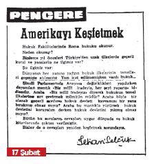 İlhan Selçuk 17 Şubat tarihli Pencere köşesinde “Amerika’yı Keşfetmek” başlığı altında, hukuk fakültelerinde Roma hukukunun okutulmasının nedenini sorgulamakla başlıyor. Yazı icat edilmemişkin dünyanın her yerinde yaygın hukuk ilkelerinin temellerinin atılmış olması gerçeğinden söze giriyor. Yasama organı ne denli güçlü olursa olsun, insanlığın ortak hukuk değerleri nedeniyle, bağımsız yargı ve bağımsız yargıçlardan vazgeçilemeyeceği gerçeğinin altını çiziyor.