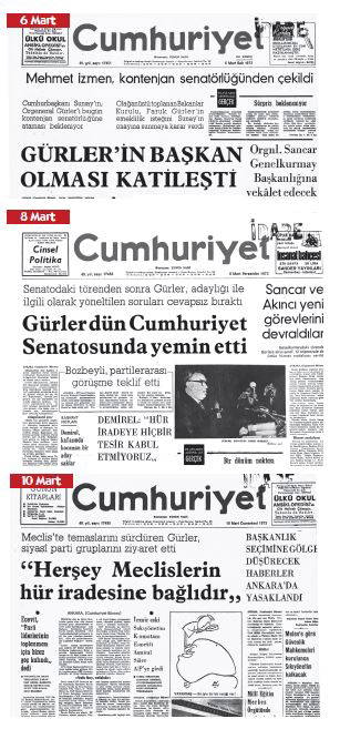 6 Mart tarihli Cumhuriyet’te Gürler’in seçilmesinin kesinleştiği bilgisi paylaşılıyor. Mehmet İzmen, kontenjan senatörlüğünden çekiliyor. Cumhurbaşkanı Sunay, Orgeneral Gürler’i kontenjan senatörlüğüne atıyor. Hızlı operasyonun sonunda 8 Mart tarihli Cumhuriyet’ten Gürler’in yemin töreninin fotoğraflı görüntüsüne tanık oluyoruz. Otyam, Başkent Notları’nda Başlığı olupbitenlere yeterince açıklık getiriyor. 8 Mart günlü Cumhuriyet’in manşetinde.