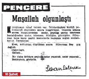 18 Şubat günlü Pencere köşesinde ise “Maşallah olgunlaştı” başlığı altında ise Demirel kimliğine 12 Mart süreci öncesi, içindeki rollerine, felsefi boyutta ince espriler katarak yaptıklarıyla değiniyor, Melen’in görevli olduğu süreçte, anayasa değişiklikleri üzerindeki Demirel’in işlevi, katkıları, geleceğe yönelik, “demokrasiyi sevmek” adına hazırlıklarının altını çiziyor; “Süleyman Bey demokrasiyi o kadar seviyor ki antidemokratik ne kadar yasa varsa, Süleyman Bey’in himmetiyle şıppadak hazırlanıyor. Hele devlet güvenlik mahkemelerine seçilecek yargıçlar konusunda hükümete yetki veren değişiklikten sonra Süleyman Bey’in tam bir demokrat olduğuna iman ettim, Demokrasi âşığı adam! Kadrini kıymetini bilememişiz. Nankör aydınlar gidip Süleyman Beyin elini öpsünler!” İlhan Selçuk devamla adamcağızın halinin de bir tuhaf olduğunun altını çiziyor. “İktidar değil, muhalefet değil, ne in ne cin bir garip âdem..” saptamalarına yer veriyor. Muhtıradan önce 236 oy olmadan istifa etmeyeceğini ilan eden Demirel’in, muhtıradan sonra anayasayı değiştirmek için 310’u bulabildiğine, Melen hükümetini düşürmek için de 226’yı aramaya kalkışmadığına değiniyor.
