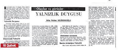 Hıfzı Veldet Velidedeoğlu’nun “Yalnızlık duygusu” başlığını taşıyan, yine 18 Şubat tarihini taşıyan yazısına, edebiyatçıların, yazarların, aydınlanmacıların yalnız kalma duyguları üzerinden zengin örneklerle giriş yapıyor.. Düşüncede yalnız kalma duygusuna da çok daha anlamlı, önemli olması ile bağlantılı, yine zengin örneklemelerle değiniyor. Oktay Akbal’ın bir yazısından aldığı örnekle, düşüncesinde önce yalnız kalmayı anlatmasını paylaşıyor. Akbal’ın aydınlanmacı yazarları bir bir örnekleyerek yalnızlıktan kurtuluş sevincini de aktardıktan sonra, kendisinin de Cumhuriyet’in aydınlanmacı yazarlarının, öğretim üyelerinin yavaş yavaş, anayasa, üniversiteler yasası, bağımsız.. yargı üzerinden cepheye, hak-hukuk savaşımı paylaşımına girmeleriyle duyduğu sevinci anlatıyor. 1961 Anayasası, özgürlüklerini savunmada hukukçular arasında önce yalnız kalma duygusunun, sonrasında haklı olduğunun savaşıma katılan hukukçuların hızla çoğalması, görüşlerinin paylaşılması, güçlenmesi ile ortadan kalkıp büyük bir sevince dönüşmesini aktarıyor.