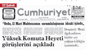 Ve Yüksek Komuta Heyeti’nin yoruma kapalı, “Ordu’nun, 12 Mart Muhtırası’nın sorumluluğunun idraki içinde” olduklarının açıklaması. Demirel, “Beni ilgilendiren hiçbir şey yoktur tebliğin içerisinde” açıklamasıyla, işin içinden çıkıyor. Nadir Nadi “Anatomi” başlıklı köşe yazısında içinde bulunulan karmaşık tablonun çizimini yapmaya çabalıyor. Olayların Ardındaki Gerçek köşesinden olağanüstü günler yaşandığı vurgulaması geliyor.