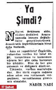 Nadi Nadi 17 Şubat 1973 tarihli köşesinde “Ya Şimdi?” başlıklı anayasa değişiklikleri sorgulamasına, “Nihayet beklenen oldu, ‘lüks’ dedikleri anayasamızda istenen değişiklikler gerçekleştirilerek demokratik özgürlüklerimiz biraz daha budandı..” vurgulaması ile giriyor. Devamla pek çok anlamlı başlıkla gelişmelerin altını çizerken, kendi yaklaşımlarını da paylaşıyor: “Ünlü hukukçularımızın, barolarımızın, Askeri Yargıtay Başkanımızın uyarılarına rağmen niçin başvuruldu bu yola?../ İktidarın kurduğu, yargıçlarını da iktidarın atadığı bir mahkeme karşısına çıktığı zaman vatandaş hakkını savunmak için kime, hangi güvenceye dayanacaktır? ../ Özgürlük yukarıdan verilen bir lütuf değil, kazanılması ve korunması uğruna her gün çaba harcanan bir ülküdür. Bize de her gün çalışmak ve didinmek düşüyor./ Ülkümüz yurdun mutluluğudur. Her türlü engele rağmen adım adım yakalamak vazgeçilemez, savsaklanamaz görevimiz olmalıdır.”