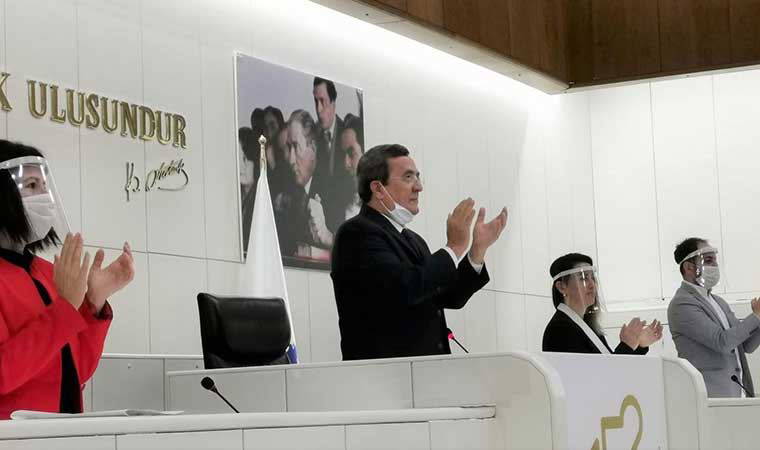 Konak Belediye Başkanı Abdül Batur, meclis oturumunun başında yaptığı konuşmada, belediyenin salgının başlangıcından bugüne yaptığı çalışmaları aktardı. Covid-19 sebebiyle vefat eden vatandaşların yakınlarına başsağlığı dileklerini ileten Başkan Batur, tedavileri süren hastalara da acil şifalar diledi. Devletin her kademesinin ve yerel yönetimlerin bu süreçte üzerlerine düşen görevleri yerine getirdiklerini ve herkesin çalıştığını vurgulayan Batur, özellikle sağlık çalışanlarına minnet duyduklarını ifade etti. Batur, meclis üyelerini, salgın sırasında çalışanlar için bir dakikalık alkışa davet ederek, “Bu süreçte vatandaşın aldığı tedbirin yanı sıra sağlık çalışanlarının cansiperane çalışmaları çok önemli. Doktorundan hastabakıcısına tüm sağlık çalışanlarına teşekkür ediyoruz. Onların hakkı ödenmez. Sağlık çalışanlarımızı biz, üç gün saat 9.00’da balkonda alkışlamıştık. Şimdi başta sağlık çalışanları olmak üzere sahada çalışan tüm meslek gruplarını bir dakika alkışlamamızı rica ediyorum” dedi. Başkan Batur’un daveti üzerine meclis üyeleri sağlık çalışanları başta olmak üzere salgın sırasında çalışan tüm meslek gruplarını bir dakika boyunca ayakta alkışladı.