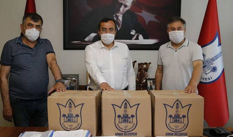 İçinde bir ailenin uzun süre kullanabileceği gıda paketlerinin bulunduğu kolileri Konak Belediye Başkanı Abdül Batur, Konak Amatör Futbol Kulüpleri Derneği Başkanı Mehmet Şerif Demir ve Dernek Yönetim Kurulu Üyesi Aslan Yıldız’a teslim etti.