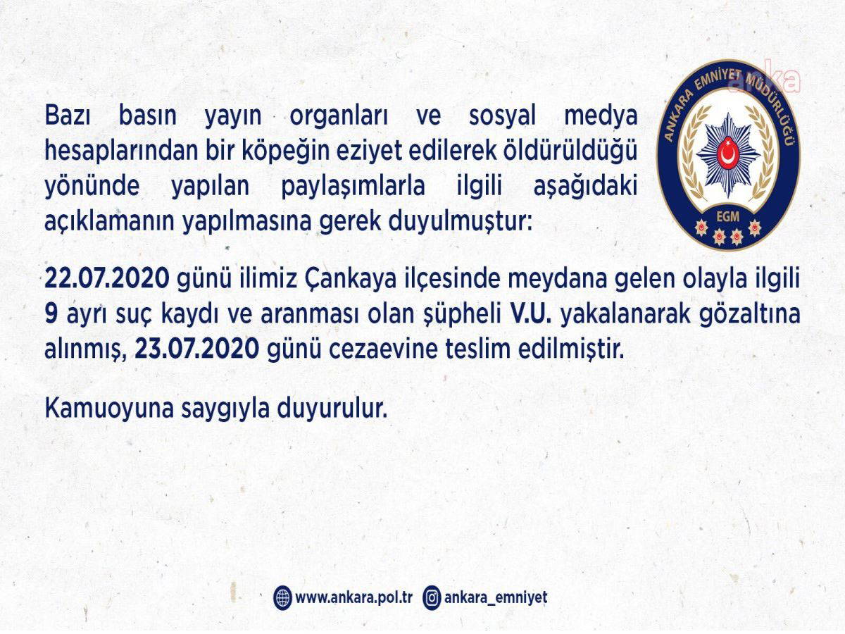Ankara Eminyet Müdürlüğü, "Çankaya'nın Küçükesat semtinde köpeğe eziyet ederek öldürüldüğü iddiasıyla suçlanan ve 9 ayrı suç kaydı bulunan Volkan Uzun'un tutuklandığını" duyurdu.