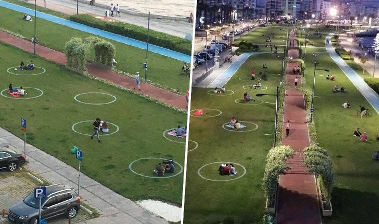 Hava sıcaklıklarının artmasının da etkisiyle İzmirliler sahil kenarlarına akın etti. Alsancak semtinde bulunan Kordonboyu vatandaşların en çok tercih ettikleri yerlerden birisi oldu. Vatandaşlar Kordonboyu'nda yürüyüş yaparken, kimi vatandaşlar da balık tuttu. Özellikle İzmir Büyükşehir Belediyesi tarafından sosyal mesafeyi korumak maksadıyla çimler üzerine çizilen çember daireler vatandaşların ilgisini çekti.