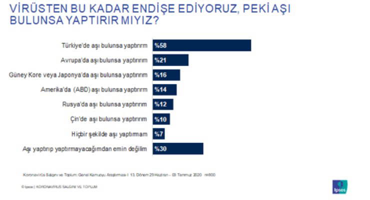 Güney Kore veya Japonya’da geliştirilse aşı yaptırmayı düşünenlerin oranı yüzde 14, Rusya’da yüzde 12 ve Çin’de yüzde 10. Emin olmayanların oranı yüzde 30. Hiçbir şekilde aşı yaptırmayacağını söyleyen yüzde 7’lik bir kesim mevcut.