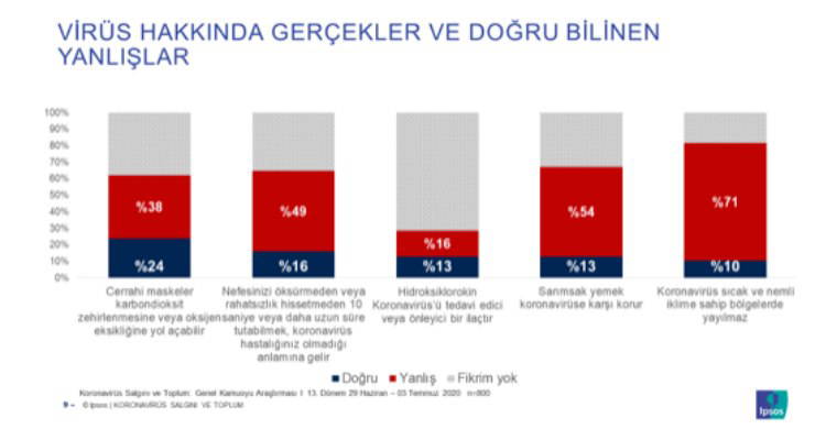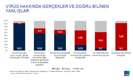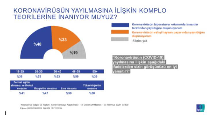 Ipsos’un Türkiye CEO’su Sidar Gedik araştırmada elde edilen verilerle ilgili şu değerlendirmelerde bulundu: “Görünen o ki, virüsün ağız-burun yolu ile bulaşması haricinde pek çok konuda toplumda bir fikir birliği yok. Gerçek bilgiye sahip olamadıkça komplo teorileri zemin buluyor. Her iki kişiden biri virüsün insan yapısı olduğunu düşünüyor. Her dört kişiden biri cerrahi maskelerin karbondioksit zehirlenmesine yol açabileceğine inanıyor. Toplumun hemen hemen yüzde 40’ı salgının 5G şebekesi nedeni ile ortaya çıkmış olması iddiası konusunda fikir belirtemiyor. Ve yine yüzde 40’a yakın bir kesim aşı bulunsa bile ya yaptırmayacak ya da kararsız. Özetle ciddi bir kafa karışıklığı, bilgi eksikliği söz konusu. Salgın ile mücadeleye toplumsal bilinçlendirme boyutunu da ekleme ihtiyacımız var.”