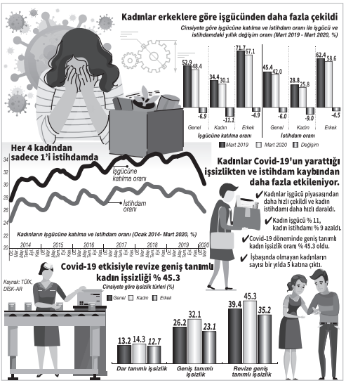 - Her dört kadından sadece biri istihdamda. Mart 2019 ve 2020 arasındaki son bir yıllık dönemde istihdam edilenlerin toplam sayısı 1 milyon 662 bin azalarak 26 milyon 133 bine geriledi.