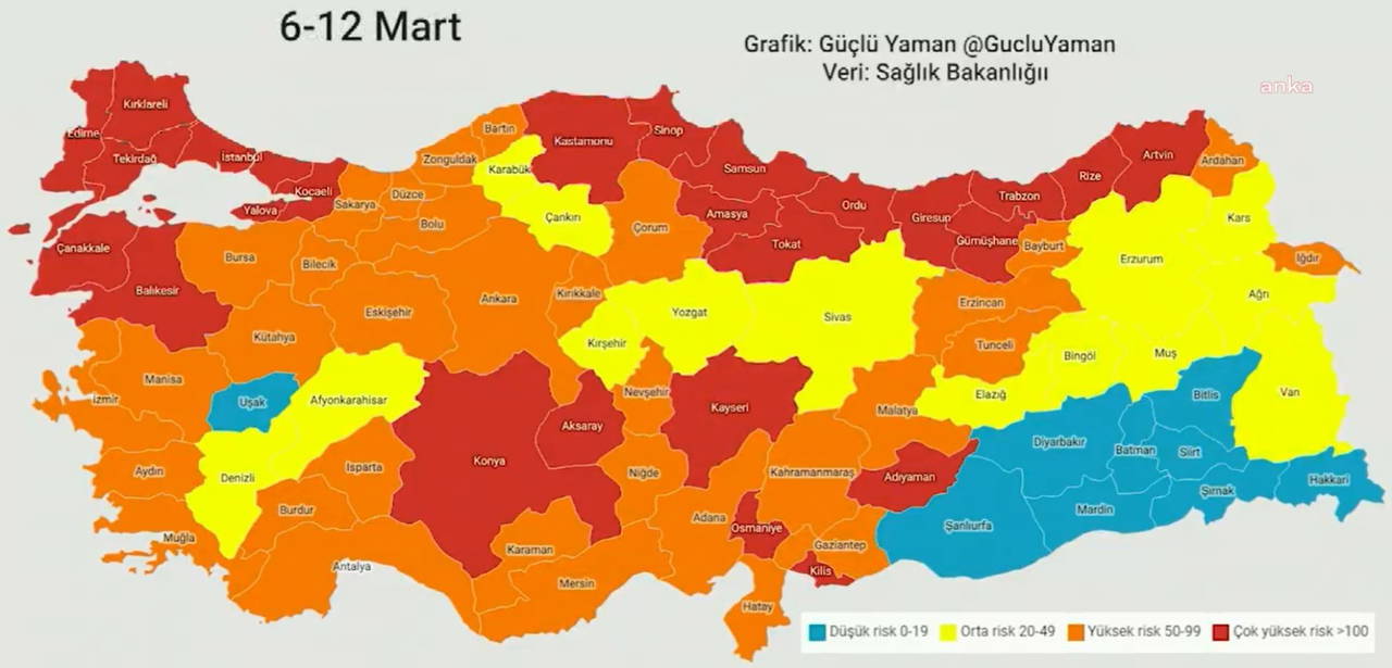 27 Şubat – 5 Mart: Kademeli normalleşme adımlarının da etkisiyle çok yüksek risk grubundaki illerin sayısı artarak 26’ya ulaştı. Orta ve yüksek risk gruplarının sayısı da artarken düşük risk grubundaki illerin sayısı ise düştü. İstanbul, Mersin, Kocaeli gibi büyükşehirler yüksek risk grubundan çok yüksek risk grubuna geçti. Ankara, Bursa gibi büyükşehirler ise orta risk grubundan yüksek risk grubuna girdi.