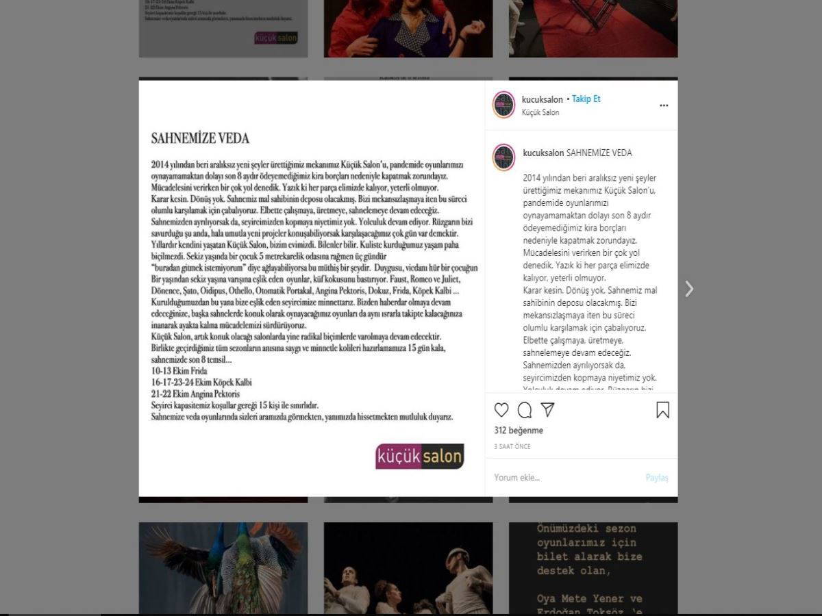 "2014 yılından beri aralıksız yeni şeyler ürettiğimiz mekanımız Küçük Salon’u, pandemide oyunlarımızı oynayamamaktan dolayı son 8 aydır ödeyemediğimiz kira borçları nedeniyle kapatmak zorundayız. Mücadelesini verirken birçok yol denedik. Yazık ki her parça elimizde kalıyor, yeterli olmuyor.