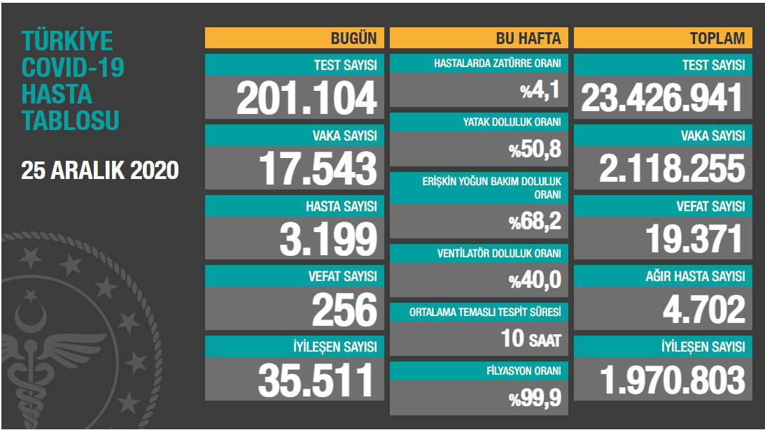 Bugün tespit edilen 17 bin 543 vakanın olduğu ifade edilen güncel koronavirüs tablosuna göre hasta sayısı da 3 bin 199 oldu.