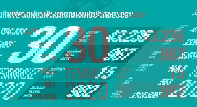 Türkiye'nin 30 Temmuz 2020 koronavirüs tablosu şöyle:
