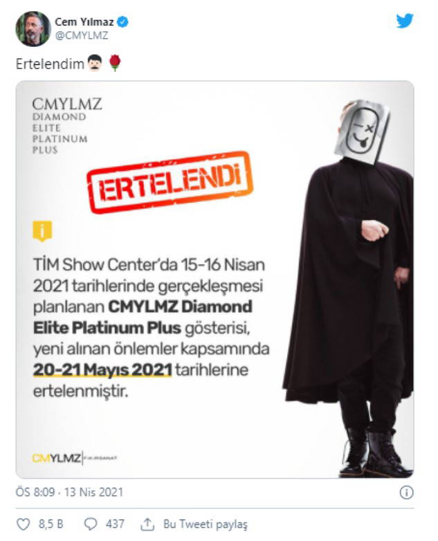 Cem Yılmaz geçtiğimiz sezona damga vuran ve kapalı gişe oynadığı CMYLMZ–Diamond Elite Platinum Plus oyununun ertelendiğini duyurdu.