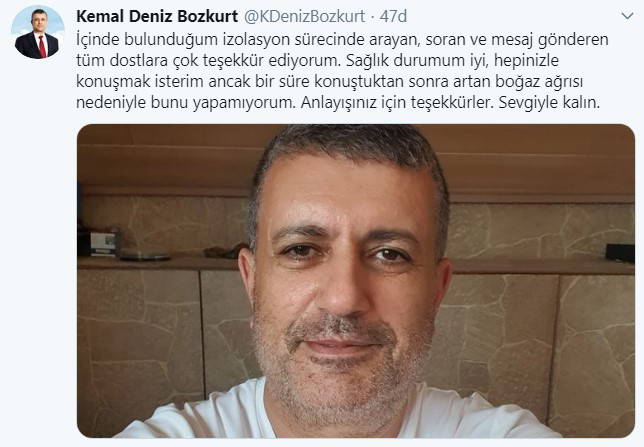 "İçinde bulunduğum izolasyon sürecinde arayan, soran ve mesaj gönderen tüm dostlara çok teşekkür ediyorum. Sağlık durumum iyi, hepinizle konuşmak isterim ancak bir süre konuştuktan sonra artan boğaz ağrısı nedeniyle bunu yapamıyorum. Anlayışınız için teşekkürler. Sevgiyle kalın."