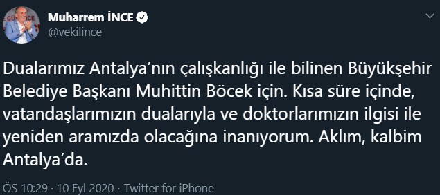 Ayrıca CHP'nin eski Milletvekili ve Cumhurbaşkanı adayı Muharrem İnce, "Dualarımız Antalya’nın çalışkanlığı ile bilinen Büyükşehir Belediye Başkanı Muhittin Böcek için. Kısa süre içinde, vatandaşlarımızın dualarıyla ve doktorlarımızın ilgisi ile yeniden aramızda olacağına inanıyorum. Aklım, kalbim Antalya’da" diyerek desteklerini sundu.