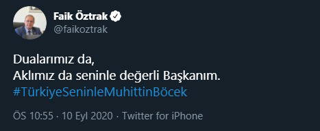 Sağlık durumu iyiye giden Böcek'e sosyal medyadan destek yağdı. Kullanıcılar ve siyasetçiler #TürkiyeSeninleMuhittinBöcek etiketinde buluştu.