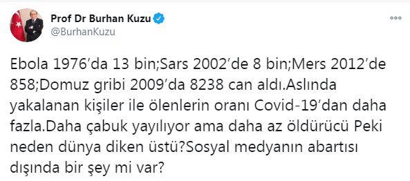 “Ebola 1976’da 13 bin; Sars 2002’de 8 bin; Mers 2012’de 858; Domuz gribi 2009’da 8238 can aldı. Aslında yakalanan kişiler ile ölenlerin oranı Covid-19’dan daha fazla. Daha çabuk yayılıyor ama daha az öldürücü Peki neden dünya diken üstü? Sosyal medyanın abartısı dışında bir şey mi var?”