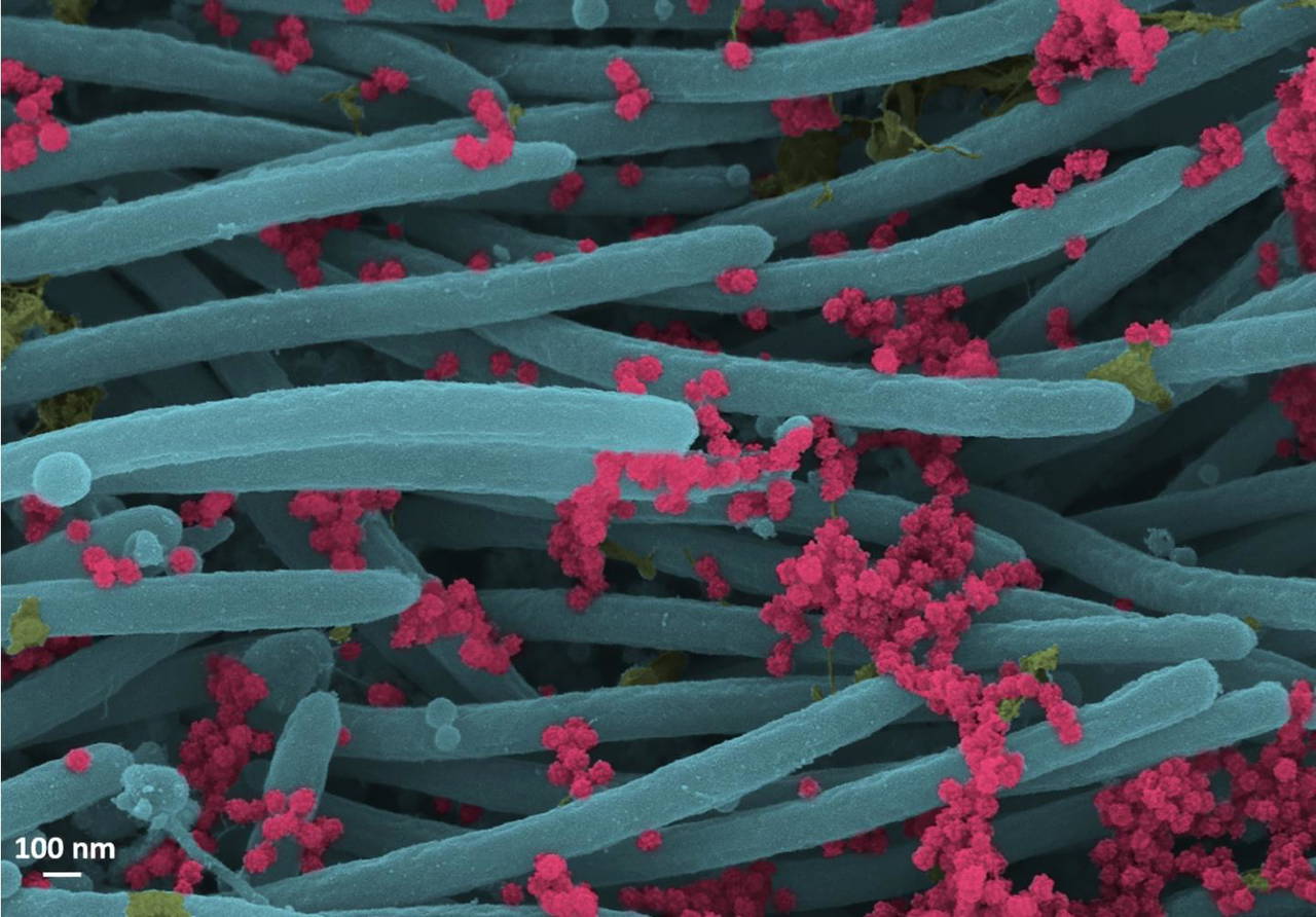 Yukarıdaki ve aşağıdaki görüntüler, NCÜ’de tıp öğrencisi olan Cameron Morrison tarafından farklı renklere boyandı. Sil (veya kirpik) adı verilen kıl benzeri bu yapılar mavi; mukus iplikleri sarımsı yeşil ve SARS-CoV-2 ise kırmızı renkte görünüyor.