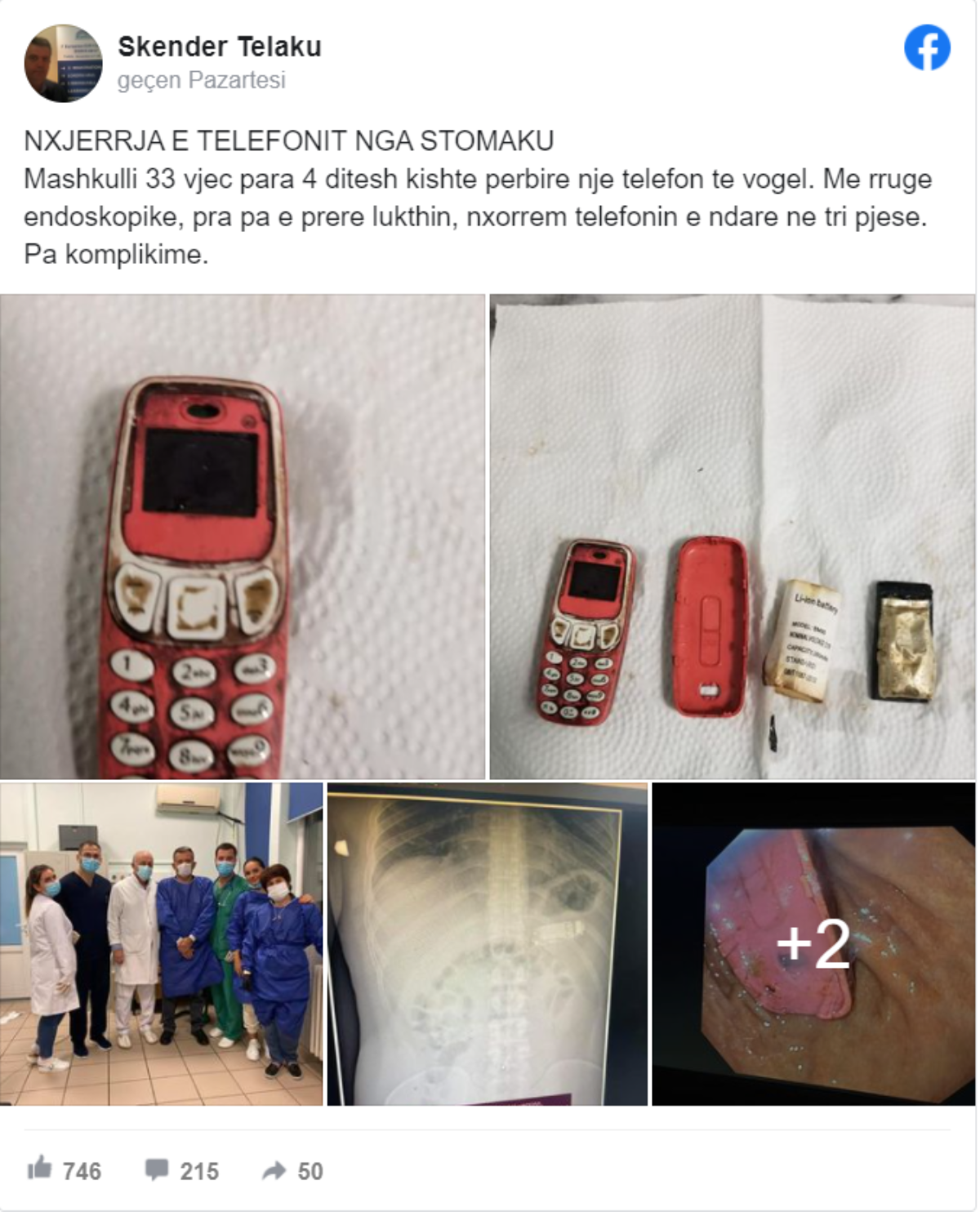 Ameliyatı yapan ekibin başındaki doktor Skender Teljaku, kimliği açıklanmayan 33 yaşındaki hastanın karnından çıkarılan Nokia’nın ünlü 3310 model telefonunun fotoğrafını Facebook hesabından paylaştı.