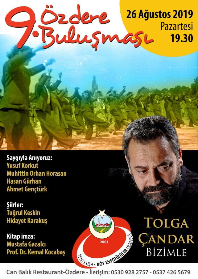 Yeni Kuşak Köy Enstitülüler Derneği, Özdere Buluşmaları'nın 9'uncusunu gerçekleştirecek. Pazartesi günü saat 19:30'da başlayacak etkinlikte Mustafa Gazalcı ve Prof. Dr. Kemal Kocabaş kitaplarını imzalayacak, halk sanatçısı Tolga Çandar ise türkülerini seslendirecek.