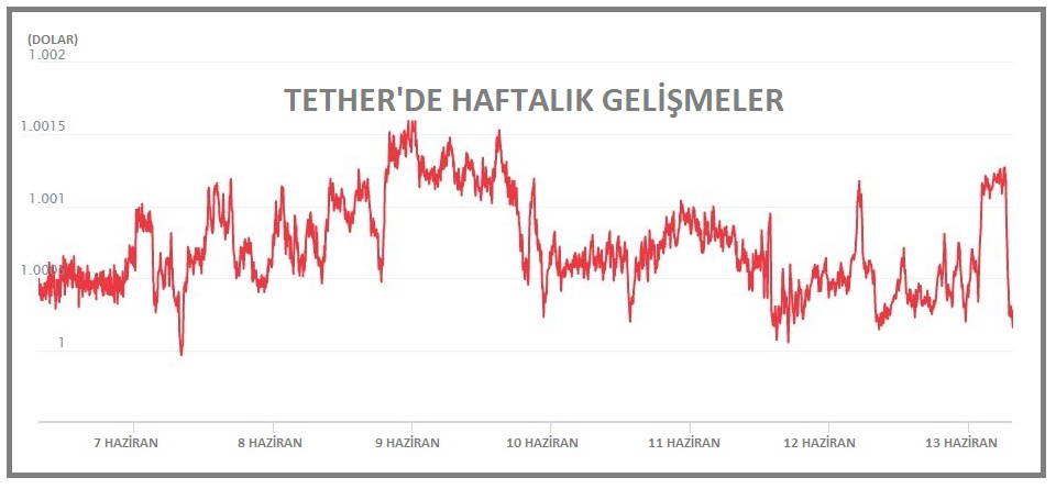 Kripto para piyasalarının üçüncü büyük birimi Tether de, 1.00 dolar dolayında dalgalandığı son 24 saatte yüzde 0.03 düştü. Birimin haftalık kaybı yüzde 0.03 ve piyasa hacmi de değişmeyerek 62 milyar dolar düzeyindeydi.