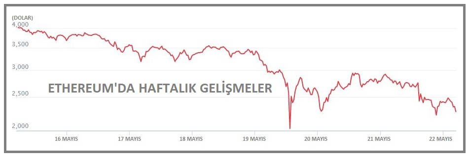 Kripto para piyasalarının ikinci büyük birimi Ethereum da, 2,113.35 ve 2,804.20 dolar arasında dalgalandığı son 24 saatte yüzde 18.27 düşüşle 2,262.16 dolara geriledi. Birimin haftalık kaybı yüzde 43.97 ve piyasa hacmi de 262 milyar dolar düzeyindeydi.