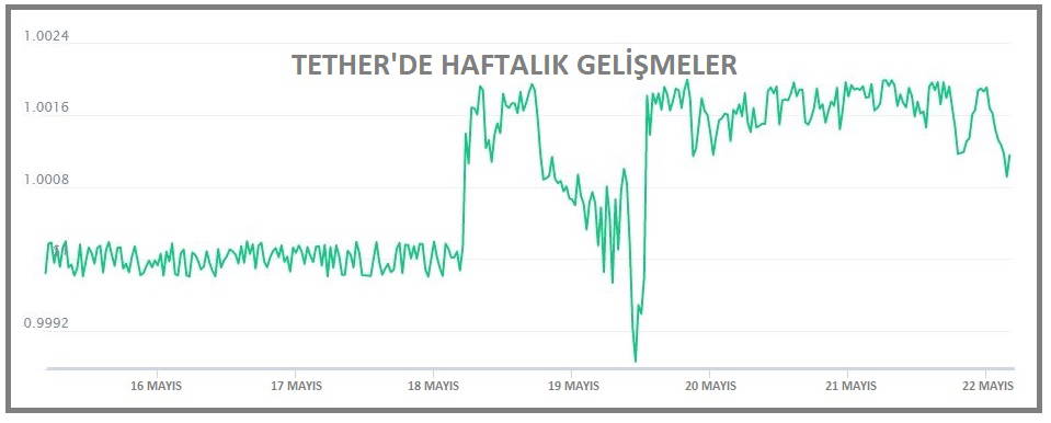 Kripto para piyasalarında yeniden üçüncü sıraya yükselen Tether de 1.00 dolar dolayında dalgalandığı son 24 saatte yüzde 0.09 düşüşle 1.00 dolardaydı. Birimin haftalık kaybı yüzde 0.12 ve piyasa hacmi de 58 milyar dolar düzeyindeydi.