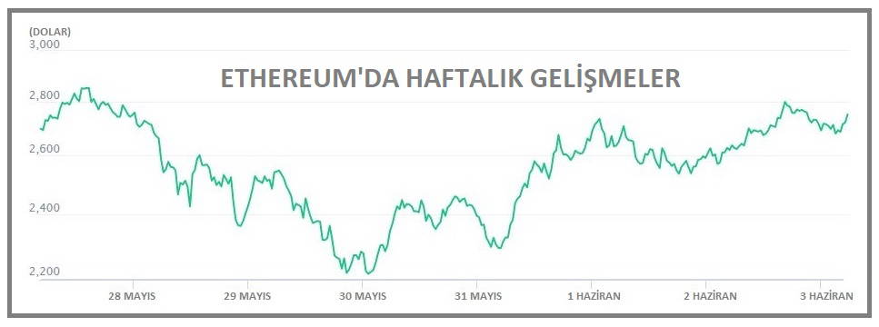 Kripto para piyasalarının ikinci büyük birimi Ethereum da, 2,611.09 ve 2,801.39 dolar arasında dalgalandığı son 24 saatte yüzde 4.31 artışla 2,750.35 dolara yükseldi. Birimin haftalık kazancı yüzde 2.38 ve piyasa hacmi de yaklaşık 15 milyar dolarlık artışla 318 milyar dolar düzeyindeydi.