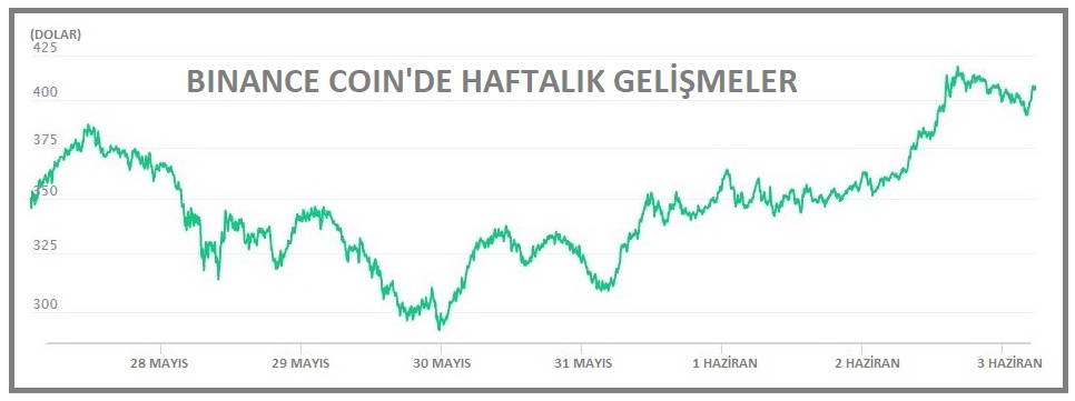 Yaklaşık 10 günlük aradan sonra kripto para piyasalarında yeniden üçüncü sıraya yükselen Binance Coin de 359.06 ve 418.67dolar arasında dalgalandığı son 24 saatte yüzde 12.65 artışla 407.57 dolara yükseldi. Birimin haftalık kazancı yüzde 16.33 ve piyasa hacmi de 62 milyar dolar düzeyindeydi.