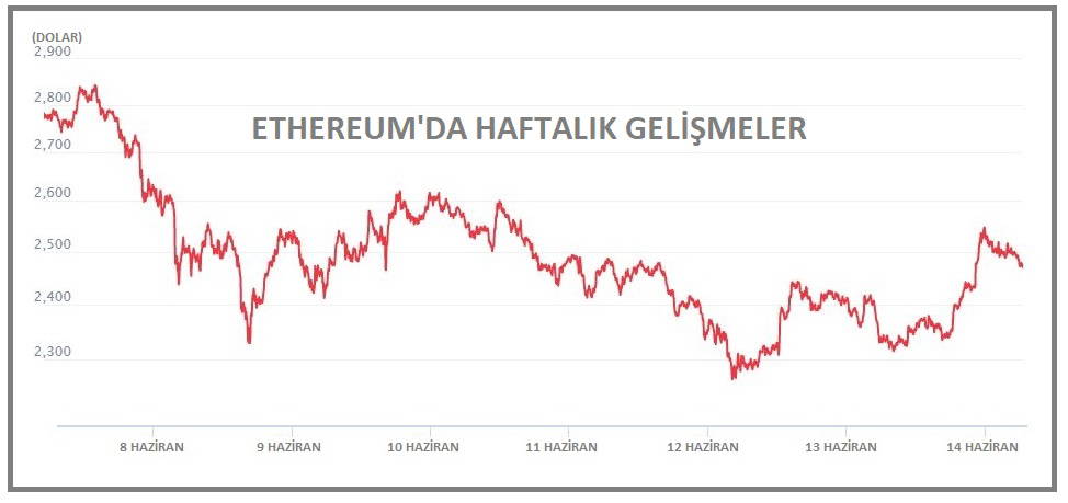 Kripto para piyasalarının ikinci büyük birimi Ethereum da, 2,312.64 ve 2,547.37 dolar arasında dalgalandığı son 24 saatte yüzde 6.34 artışla 2,485.13 dolara yükseldi. Birimin haftalık kaybı yüzde 10.53 ve piyasa hacmi de yaklaşık 17 milyar dolarlık artışla 288 milyar dolar düzeyindeydi.