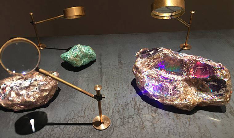 Ametistten farklılar sanki parlaklıkları farklı, derken Pera Müzesi’nde yeni açılan “Kristal Berraklığı” sergisinde Kıymet Daştan’ın standı önünde takılıp kaldım, ayrılamıyorum. Önce işin adı sandım ama hayır sanatçının adı, Daştan. Taşa bakıyorum ya. Birazdan kendisi de geliyor ve uzun uzun eserini anlatıyor, anlattıkça gözlerimiz hayretle açılıyor! Ametisti andıran mor kuvars görünümlü maddeler aslında eski CD’lermiş! Mimar Sinan Güzel Sanatlar Heykel Bölümü’nü birincilikle bitiren sanatçı Beyrut’ta bir süre kalıp oradaki müzelerde yaptığı incelemelerden esinlenmiş, araştırmaları, denemeleri derken bu çalışmayı gerçekleştirmiş. Değişik materyallerin yüksek ısıda erimesinden ortaya çıkan formların ışığı farklı biçimlerde yansıtması ve ilginç görünümleri ona geniş bir çalışma olanağı vermiş. Önlerine birer de lup koyarak bu görsel şölene davet ediyor izleyiciyi. Tabii serginin konseptiyle ilgili olarak felsefi pek çok şey anlatılıyor ama gözün gördüğüne daha ne eklemeli? Güzel, hayallere salıyor, merak uyandırıyor, göz kırpıyor. Serginin adına da pek uygun düşüyor!