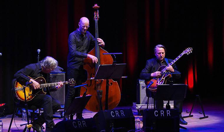Belçikalı gitarcı davulsuz projeleri seviyor, sayısız böyle plakta da çaldı bugüne değin. Bu akşamki orkestra konfigürasyonu en ilginç olanlarından biri. Üçlüsünde yanında iki Alman var; biri sandalyeye oturuşundan gitarı tutuşuna, Jobim stili saçlarına kadar tipik bir beyefendi gitarcı Paulo Morello, diğeri ise (daha önce iki kez ülkemize gelen) ELF Trio’nun basçısı melodi ustası Sven Faller.
