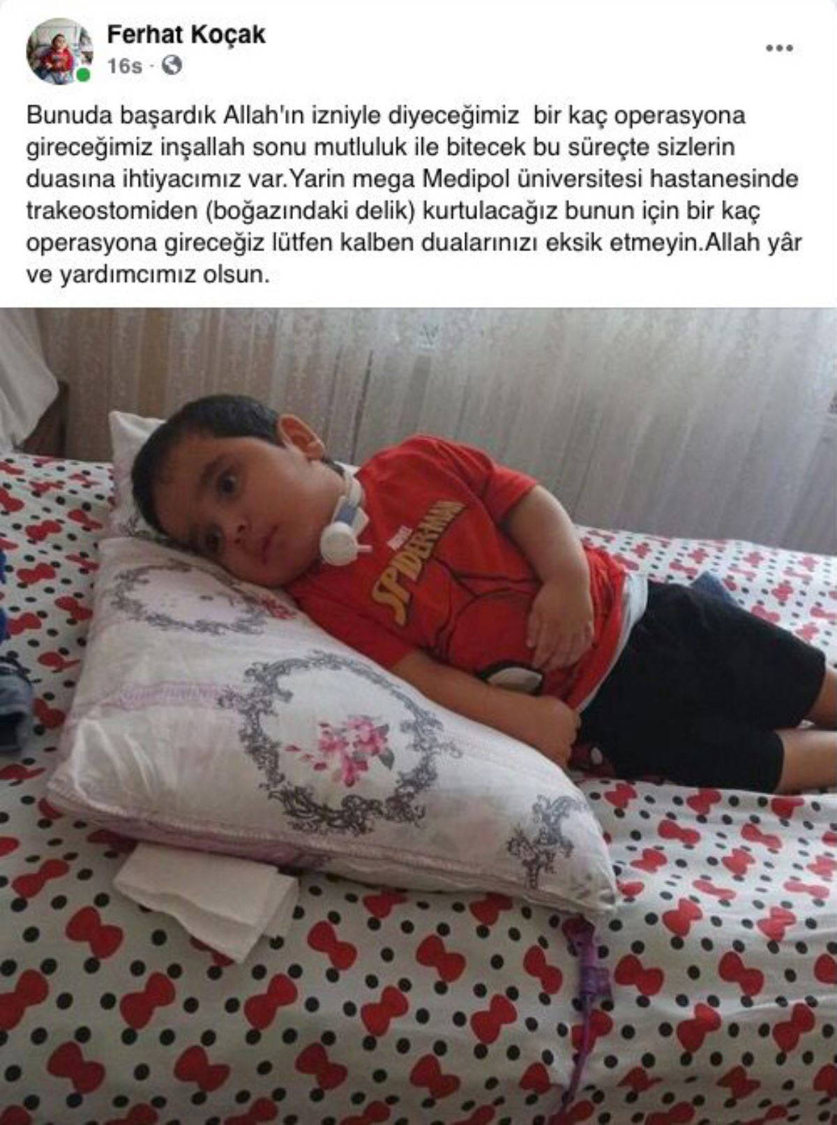 Baba Ferhat Koçak sosyal medya üzerinden yaptığı paylaşımda, ''Bunu da başardık. Allah'ın izniyle birkaç operasyona daha gireceğiz ve inşallah sonu mutlulukla bitecek. Bu süreçte sizlerin duasına ihtiyacımız var. Yarın özel bir hastanede trakeostomiden (boğazındaki delik) kurtulacağız.