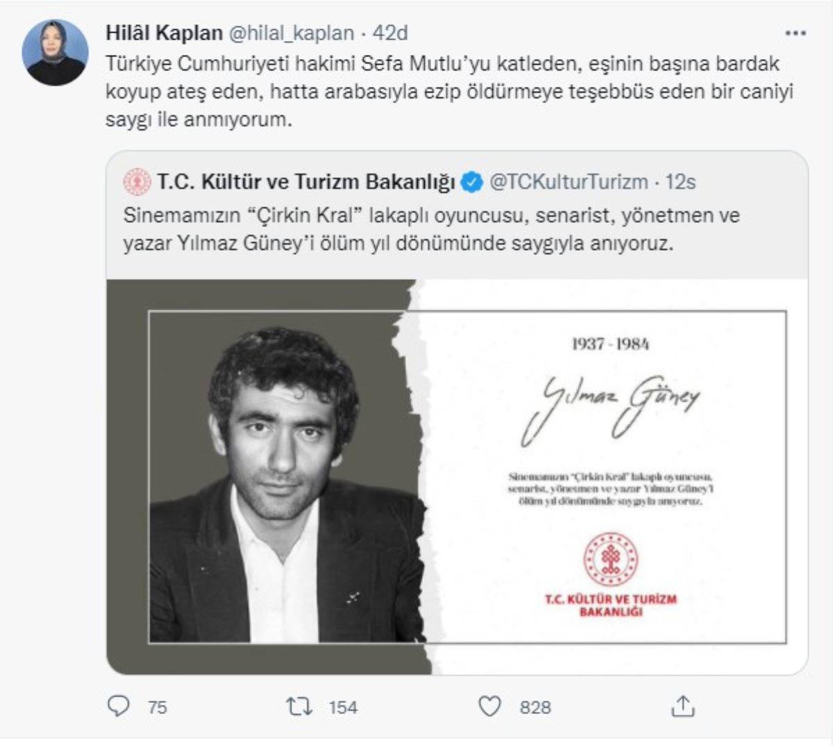 Kaplan, Kültür ve Turizm Bakanlığı'nın paylaşımını alıntılayarak, "Türkiye Cumhuriyeti hakimi Sefa Mutlu’yu katleden, eşinin başına bardak koyup ateş eden, hatta arabasıyla ezip öldürmeye teşebbüs eden bir caniyi saygı ile anmıyorum" ifadelerini kullandı.