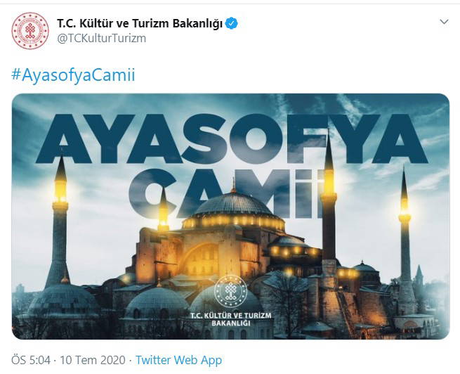 Danıştay'ın kararının ardından Twitter üzerinden paylaşım yapan Kültür ve Turizm Bakanlığı 'Ayasofya Camii' ifadelerini kullandı: