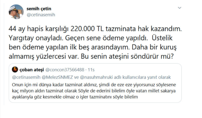 Balyoz kumpası nedeniyle tutuklanan ve 44 ay sonra hatliye olan emekli Tümamiral Semih Çetin'i, "çoban ateşi" isimli hesabın kullanıcısı hedef aldı.