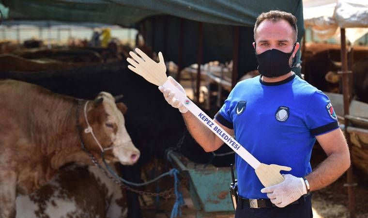 Belediye, kurbanlık alıcı ve satıcıları tarafından geleneksel hale gelen tokalaşmayı yapabilmesi için temsili tokalaşma eli tasarlayarak, içinde tek kullanımlık eldiven ve dezenfektan bulunan 'Pazarlık kiti' hazırladı.